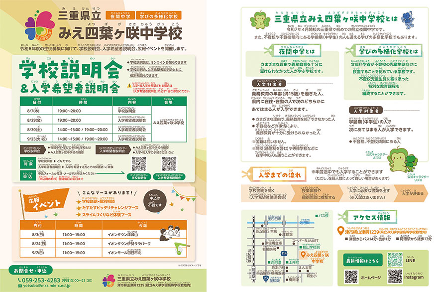 「三重県立(みえけんりつ)みえ四葉ヶ咲中学校(よつばがさきちゅうがっこう)」 がっこう せつめい かい & にゅうがく きぼうしゃ せつめい かい